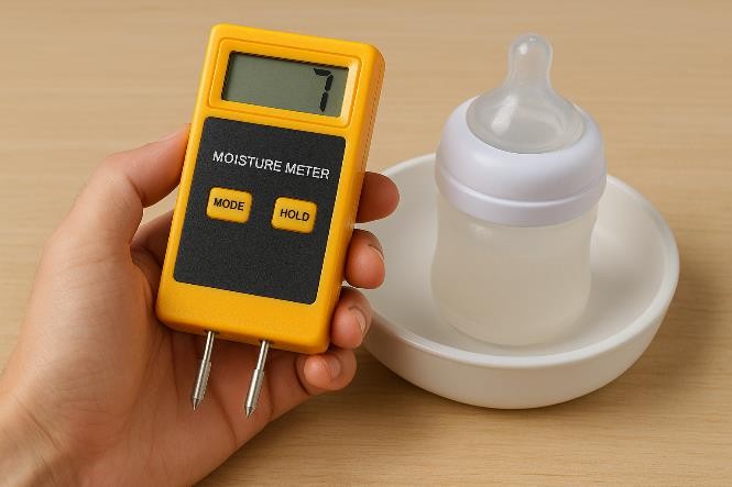Pengujian sistem pengeringan dilakukan guna mengetahui tingkat kekeringan pada peralatan makan dan minum bayi. Pengujian dilakukan dengan menggunakan alat ukur moisture meter dengan skala 1-10. Alat ini mengukur hambatan yang dialami oleh arus listrik yang mengalir di antara pin, yang letaknya ada di atas meteran